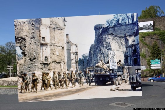 In this composite image a comparison has been made of Saint Lo, France. D-Day took place on June 6, 1944. *** COLOR 2014*** Images # 493782069. SAINT LO, FRANCE – MAY 7: A view of the roadway on May 7, 2014 in Saint Lo, France. The Allied invasion to liberate mainland Europe from Nazi occupation during World War II took place on June 6, 1944. Operation Overlord, known as D-Day, was the largest sea borne invasion in military history. (Photo by Peter Macdiarmid/Getty Images) ***ARCHVE 1944*** Images #107759178. Operation Overlord Normandy, United States Army trucks and jeeps are driving through the ruins of Saint-Lo. July 1944. A group of American soldiers is walking along the street. The town was almost totally destroyed by 2,000 Allied bombers when they attacked German troops stationed there during Operation Overlord in June. France. (Photo by Galerie Bilderwelt/Getty Images)